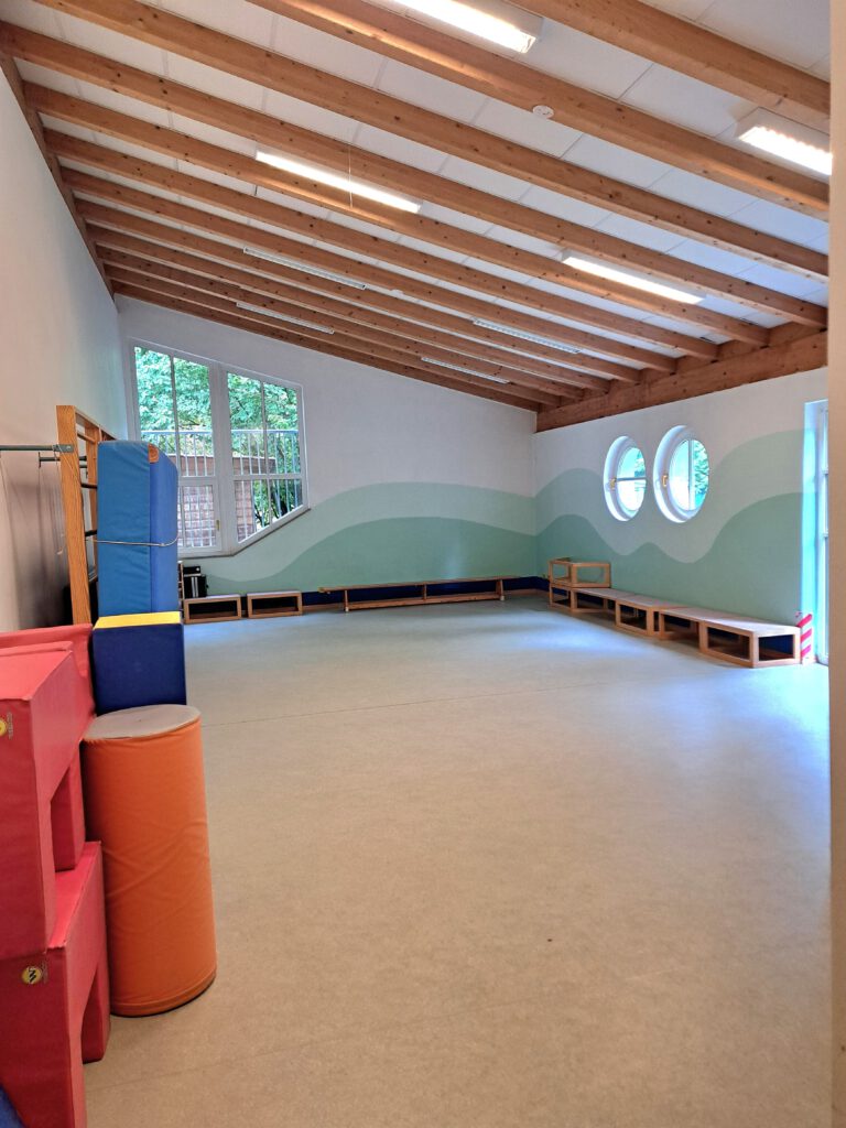 Unser Mehrzweckraum ist mehr als ein reiner Bewegungsraum. Natürlich ist er sehr beliebt für Bewegungsangebote und -impulse. Doch ist er gleichermaßen der Ort, an dem beide unsere Gruppen regelmäßig zusammenkommen, um in einer freundlichen und hellen Atmosphäre gemeinsam zu singen, zu musizieren und zu spielen.
